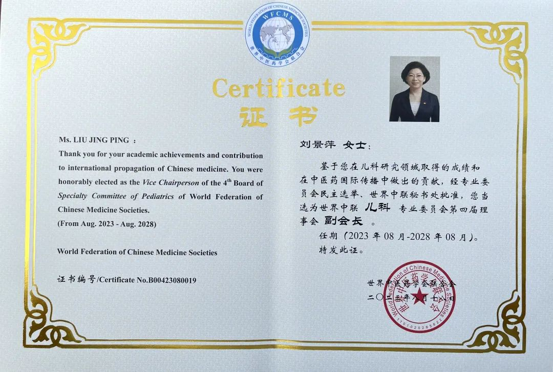财神争霸药业集团党委书记、董事长刘景萍当选世界中医药学会联合会儿科专业委员会第四届理事会副会长